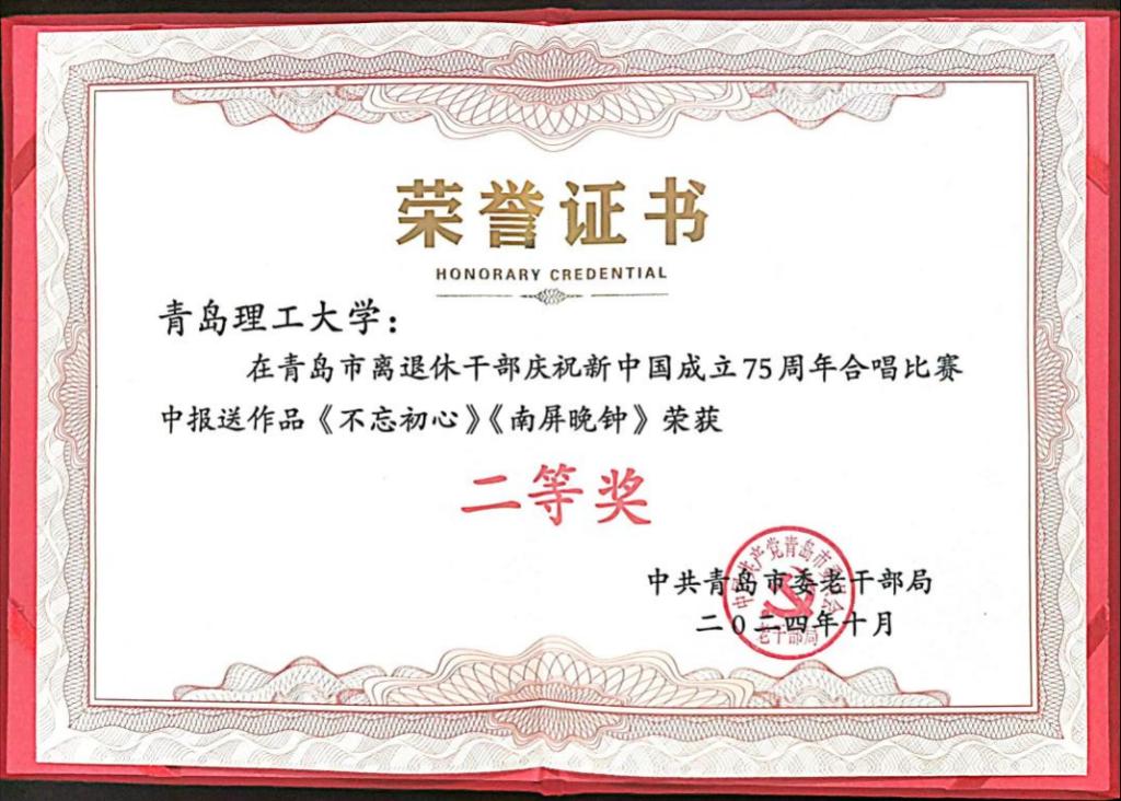 近日,我校离退休干部“唱响新时代”合唱团在青岛市委老干部局举办的“青岛市离退休干部庆祝新中国成立75周年合唱比赛”中,所报送作品《不忘初心》、《南屏晚钟》荣获二等奖第一名。此次比赛入围获奖单位共18个,其中获奖高校3所。学校同时荣获优秀组织奖。