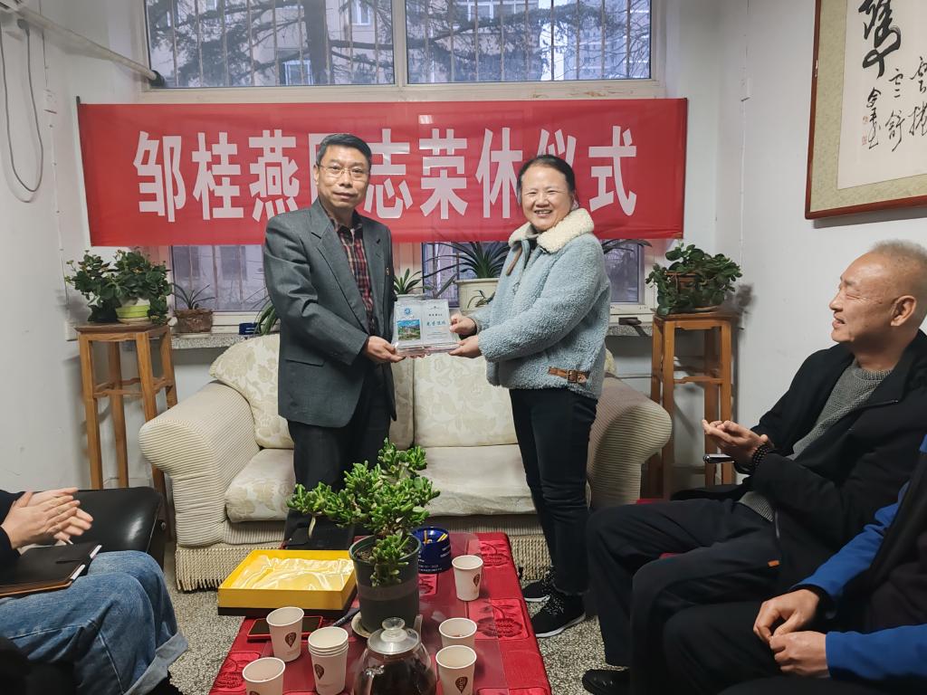 随后,李书记为退休职工邹桂燕颁发荣休纪念杯并合影留念。(撰稿:邵景玲、曲红;审核:李洪民)