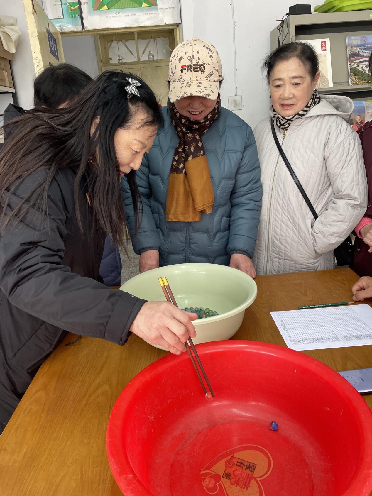 (黄岛退休女同志参加筷子夹球活动)