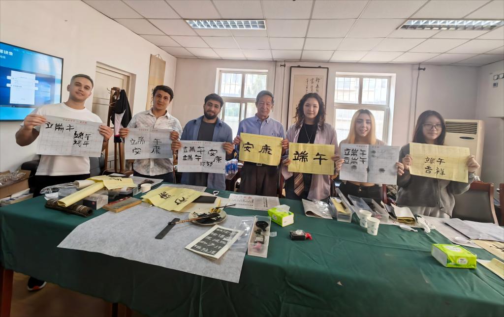 退休老同志董秉贤手把手教留学生书写毛笔字“端午安康”,对于留学生而言颇具挑战,但他们兴趣浓厚,亲身领略了中国书法的艺术魅力。