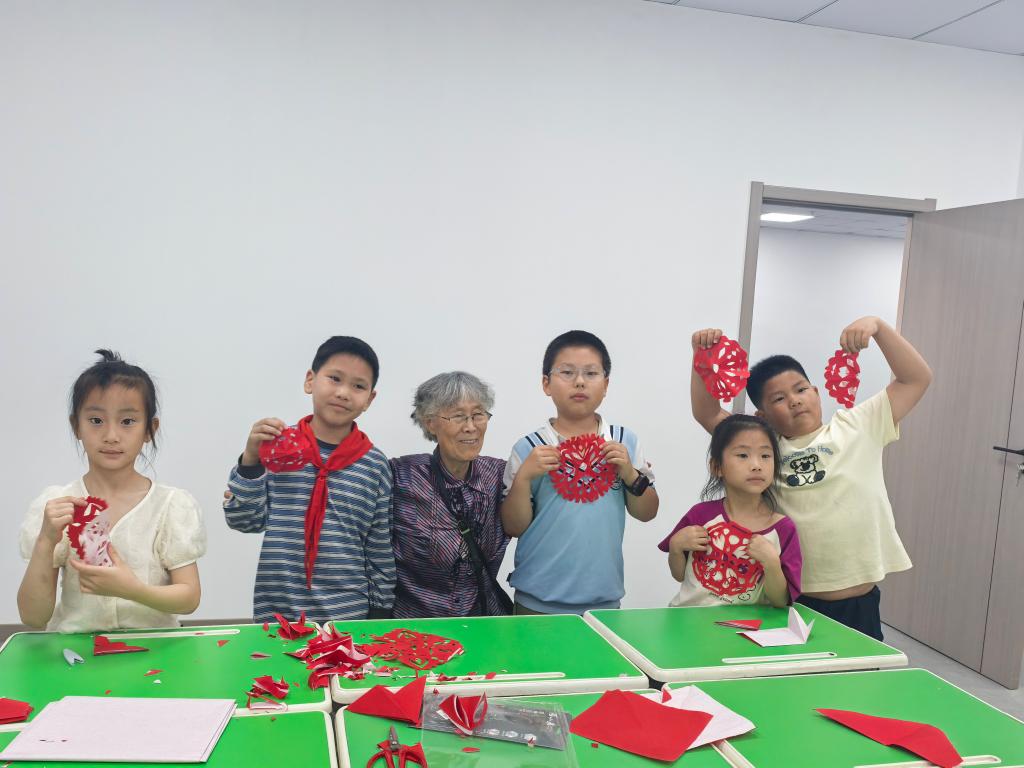 我校81岁的退休干部郭素宽在现场教孩子剪纸技艺,激发孩子对传统技艺的热爱和创新意识的养成。伴随着 “咔嚓”声和欢笑声,一张张红纸在孩子们的指尖上下摆动,不一会儿,一幅幅栩栩如生的“团花”就呈现在大家手中。一幅幅剪纸作品,一张张开心的笑容,组成了最美的画面。